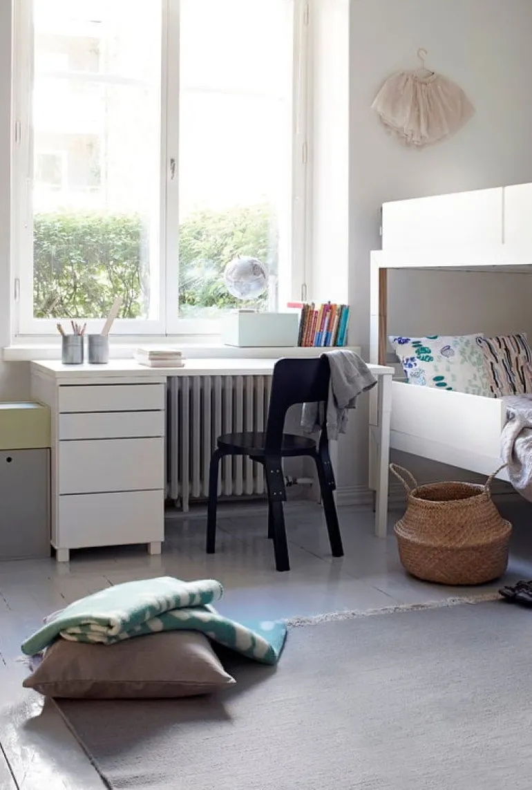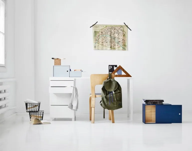 The Lundia Classic desk’s beautifully simple design language makes it a truly timeless piece of office furniture that is also ideal for the kids’ room. The desk top is made of durable laminate that is easy to clean, and the wooden legs are decorated with white painted metal details. The desk’s four drawers in two different sizes help in keeping the desk top tidy.