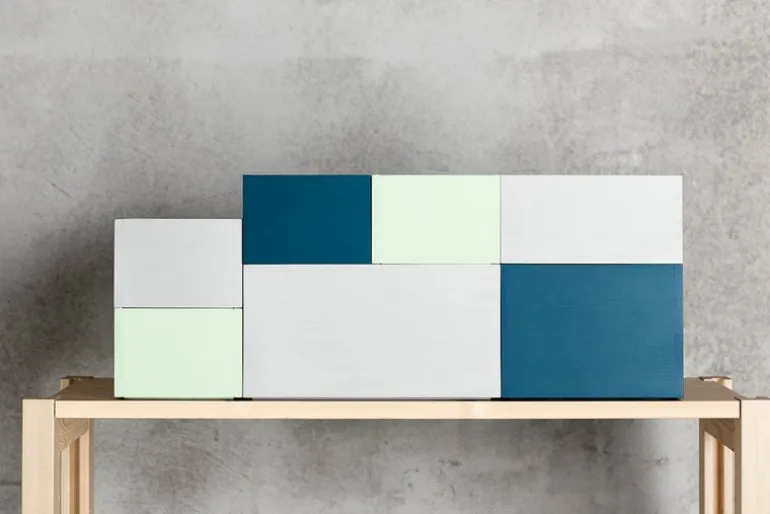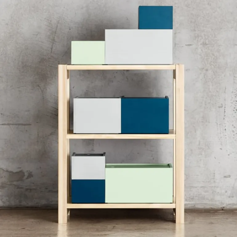 The wooden System boxes, designed by Joanna Laajisto for Lundia, are perfect for storing small objects and magazines. They fit perfectly into Lundia’s Classic shelving system and can also be used as stand-alone elements such as side tables. The System boxes are handmade form pinewood and painted in cool shades of mint, blue and gray, allowing the beautiful wood grain to show through.