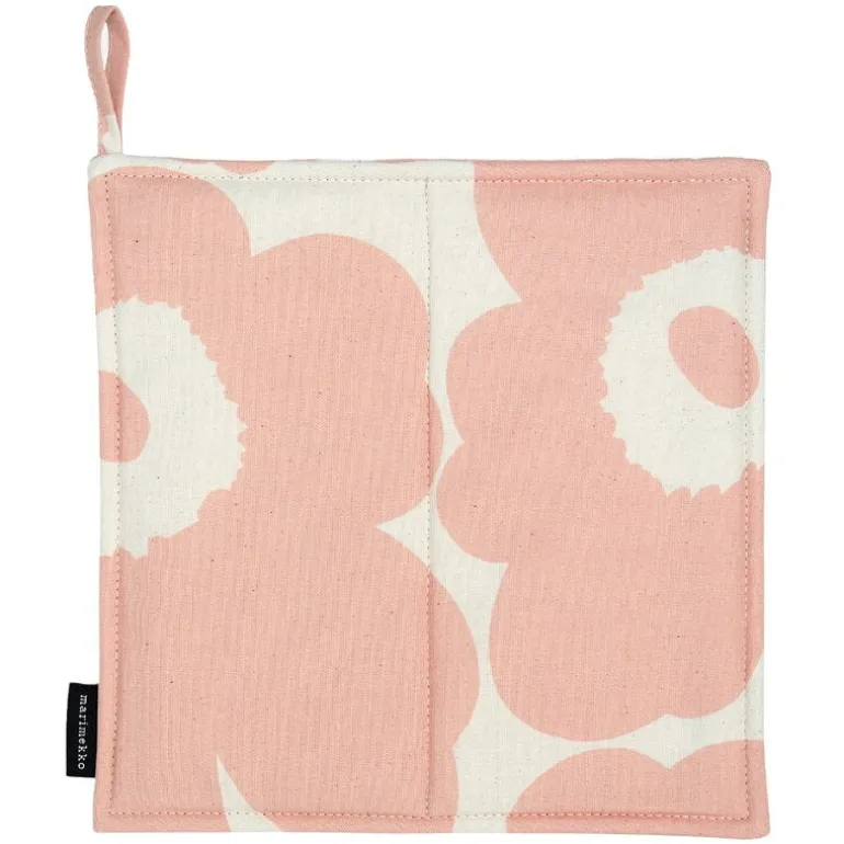Marimekko’s Pieni Unikko pot holder features Maija Isola’s iconic floral pattern in shades of unbleached cotton and peach. The pot holder is made of padded cotton-linen fabric, and it has a convenient hanging loop.