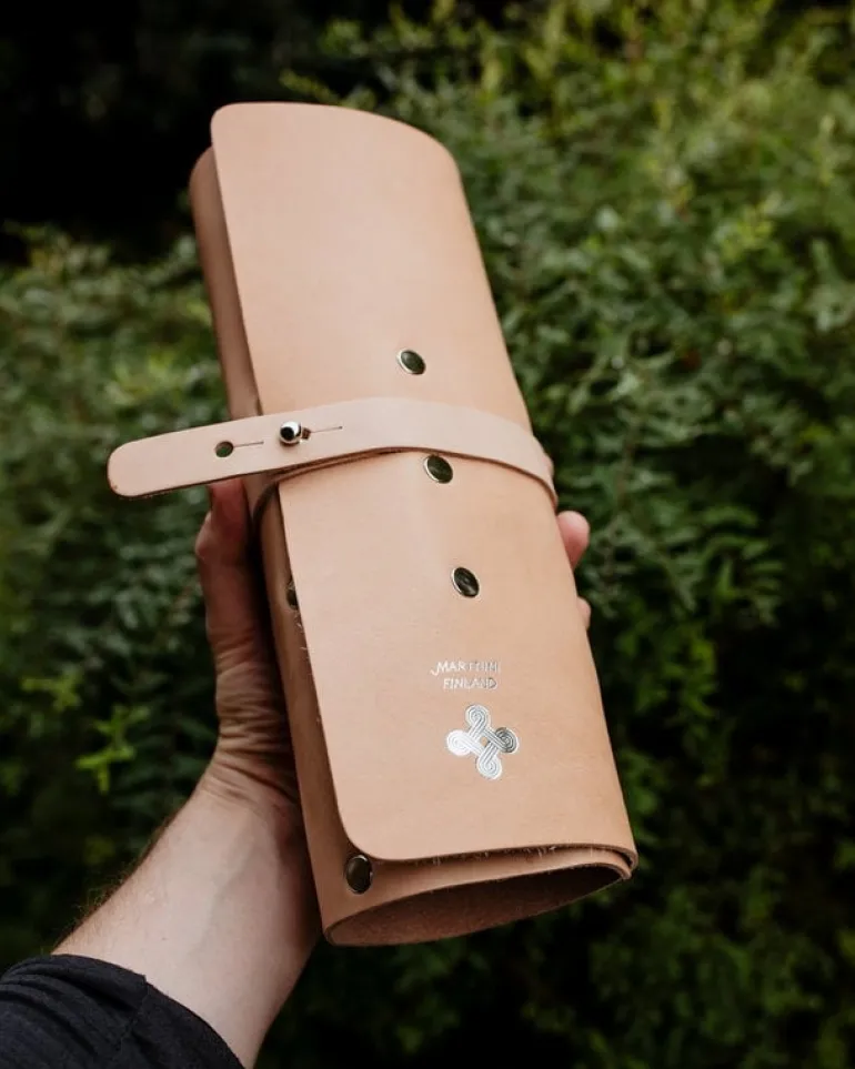 The knife roll, designed in collaboration between Marttiini and designer Harri Koskinen, is shaped so that knives can be easily taken out of the roll without even opening the wrap. The knife roll can also be hung on a nail, for example in a cottage kitchen, where storage space may be more limited.