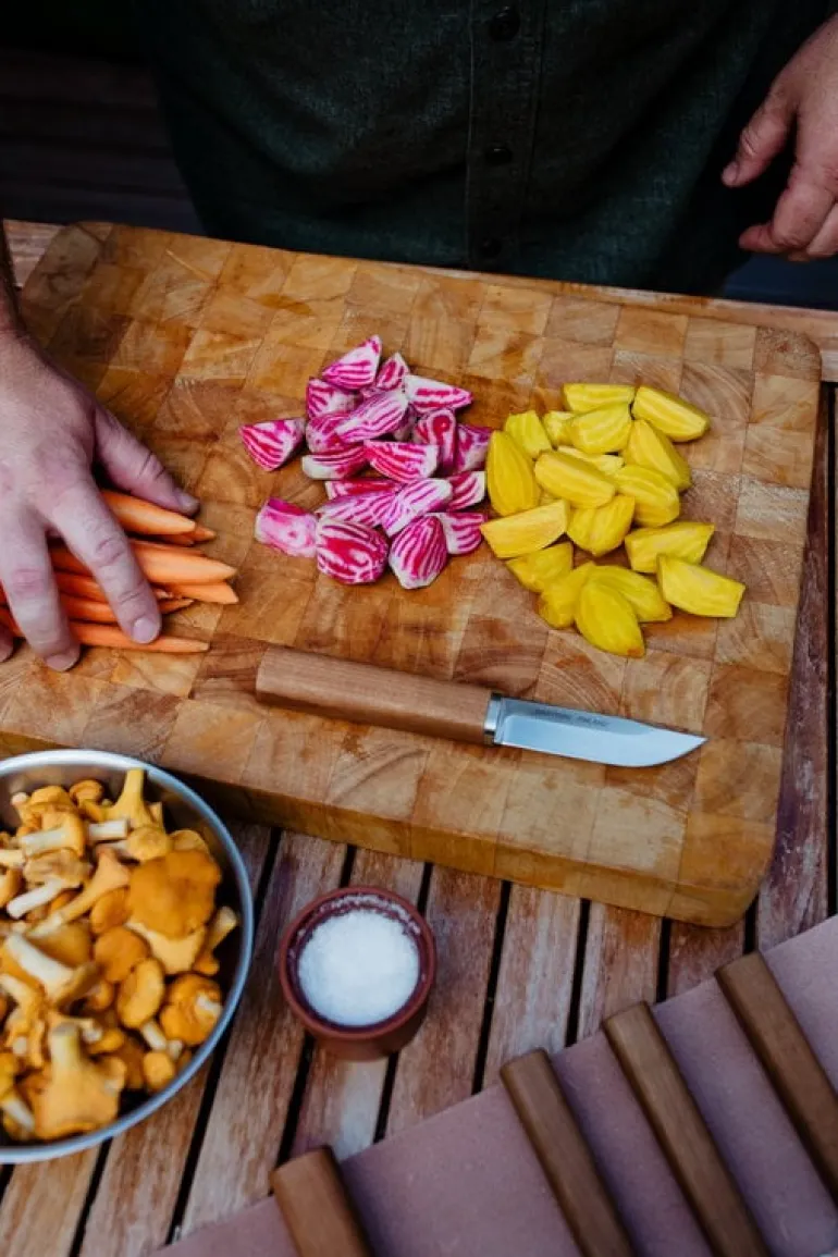 Marttiini’s Cabin Chef little knife is a conveniently sized universal knife that can be used, for example, as a peeling knife and for chopping mushrooms or vegetables in the cabin kitchen or for small chores at the campfire. Thanks to its small size and simple design language, the stainless steel knife also makes a great steak knife for the dinner table.