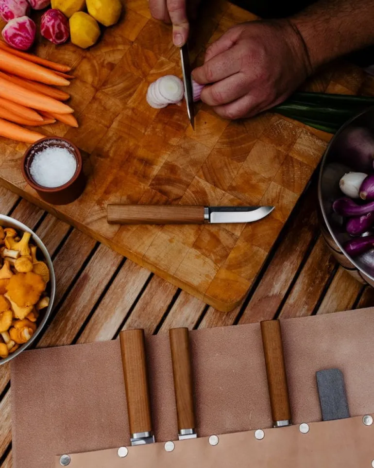 The Cabin Chef little Nordic knife is part of the eponymous knife collection, designed by Harri Koskinen, that fuses unpretentiously beautiful design with utmost functionality. Created in collaboration with Marttiini and top chef Pekka Terävä, the collection was inspired by the unique charm of Nordic nature: it offers all the knives you could need for handling nature’s gifts in the camping or cabin kitchen as well as when cooking at home. The Cabin Chef knives are made in Finland and come with a traditional natural leather sheath.
