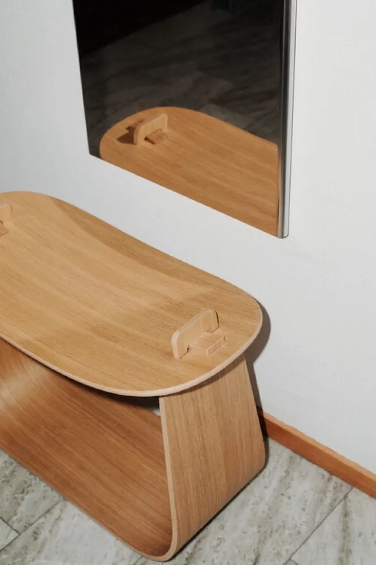 Harry stool by Massproductions has a flowing and harmonic visual language inspired by the Japanese Torii shrine gates. The Harry stool’s effortless yet impressive design comes from two bent oak sheets held together with traditional Japanese wood joinery techniques. Thanks to its minimalistic design, Harry fits smoothly into various interiors: it can be used as a seat in the kitchen, but it also finds its place as a footstool in the living room or as a side table in the hallway. Multifunctional, and suitable for many situations and spaces, this stool is built to last.