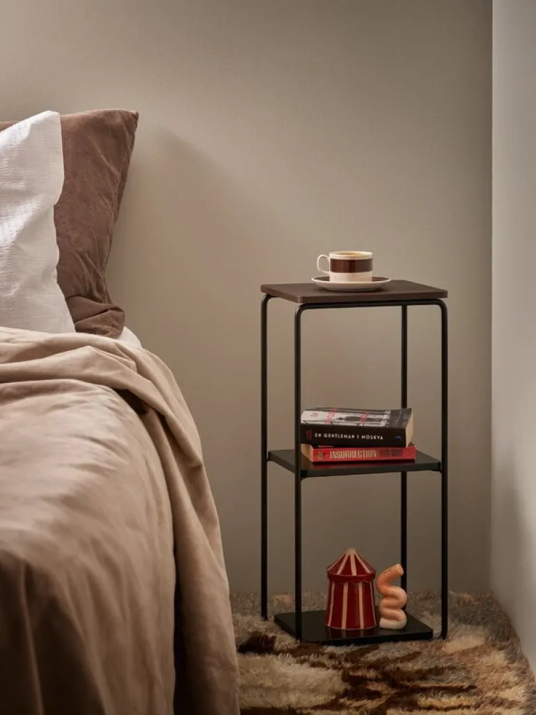 Maze’s Mixrack floor shelf, designed by Tapio Anttila, features three shelves placed on a metal wire frame. The oak veneer on the top shelf gives a nice organic touch to the otherwise industrial design. This minimalistic and versatile freestanding floor shelf is suitable for various uses – you can use it, for example, as a nightstand, plant stand or side table in a room of your choice. You can also place several Mixrack shelves in a row or pair the shelf with other members of the Mixrack collection.