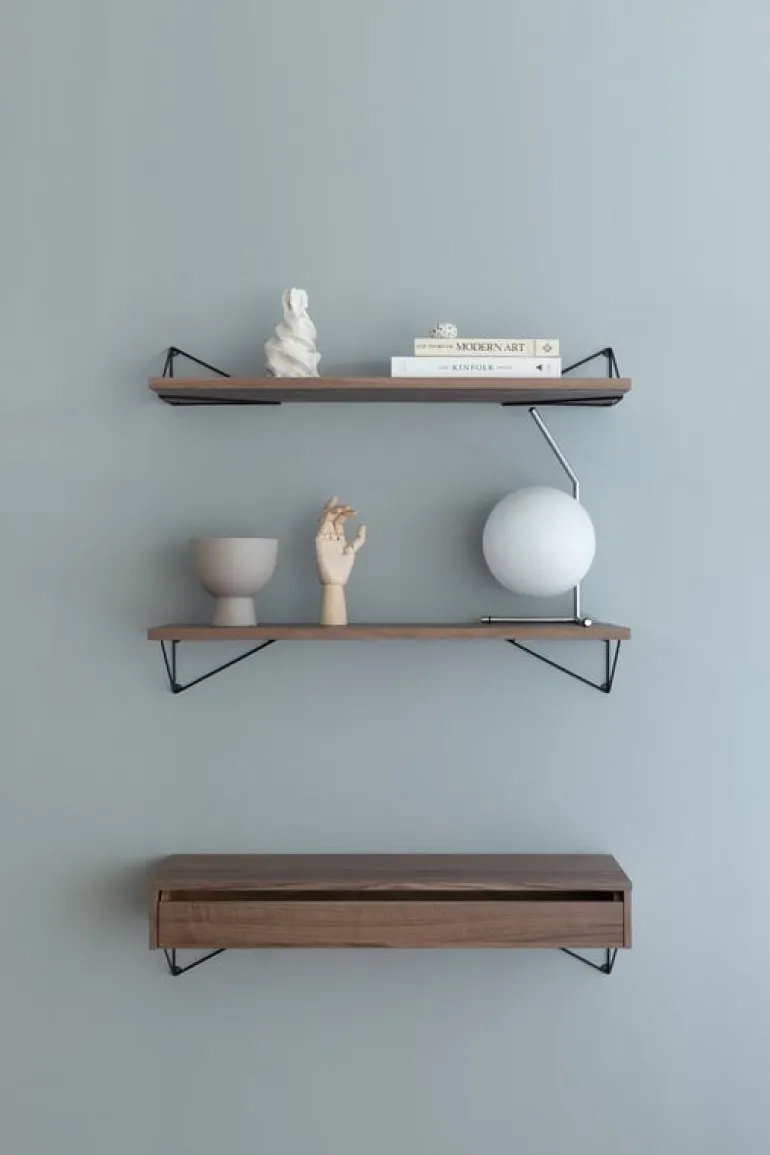 Pythagoras wall brackets, shelves, and drawers give you the freedom to create shelves of various sizes, colors and shapes in any space. Use them to build a single wall shelf, bedside table, corner shelf, set of kitchen drawers, or a large shelving module covering an entire wall. The wall brackets can be mounted either below or above the shelf or drawer in four different positions, and their airy design leaves room for blank space as well. Play, experiment, and create the perfect shelf for your own needs!