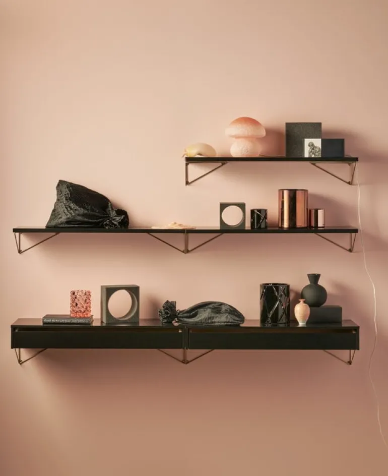 Pythagoras wall brackets, shelves, and drawers give you the freedom to create shelves of various sizes, colors and shapes in any space. Use them to build a single wall shelf, bedside table, corner shelf, set of kitchen drawers, or a large shelving module covering an entire wall. The wall brackets can be mounted either below or above the shelf or drawer in four different positions, and their airy design leaves room for blank space as well. Play, experiment, and create the perfect shelf for your own needs!