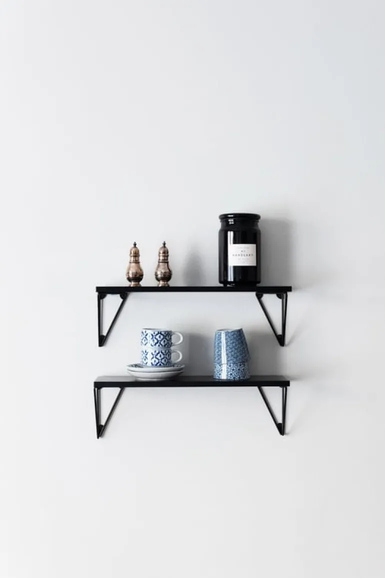 The Pythagoras XS shelf comes with two wall brackets made of 100% recycled metal. The wall brackets can be mounted either below or above the shelf in four different positions, and their airy design leaves room for blank space as well. Play, experiment and create the perfect shelf for your own needs!
