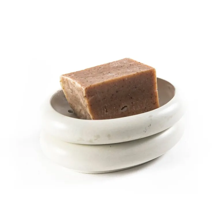 The soap tray is hand-carved in Kenya from sustainably quarried soapstone. The natural stone is characterized by a silky-smooth texture as well as marble-like veining in varying hues of red, brown and black. Due to the artisanal manufacturing method and the natural material, each soap dish is a unique piece of artisanship, and signed by the artisan who made it.