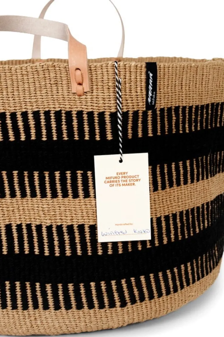 Mifuko’s Pamba floor basket combines two natural materials: wool and paper yarn. Due to its material combo, the basket is soft, flexible and decorated with a lovely white and brown pattern.