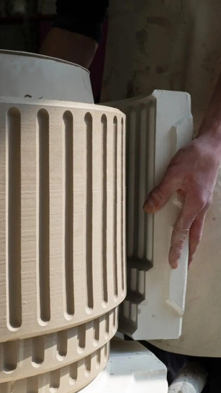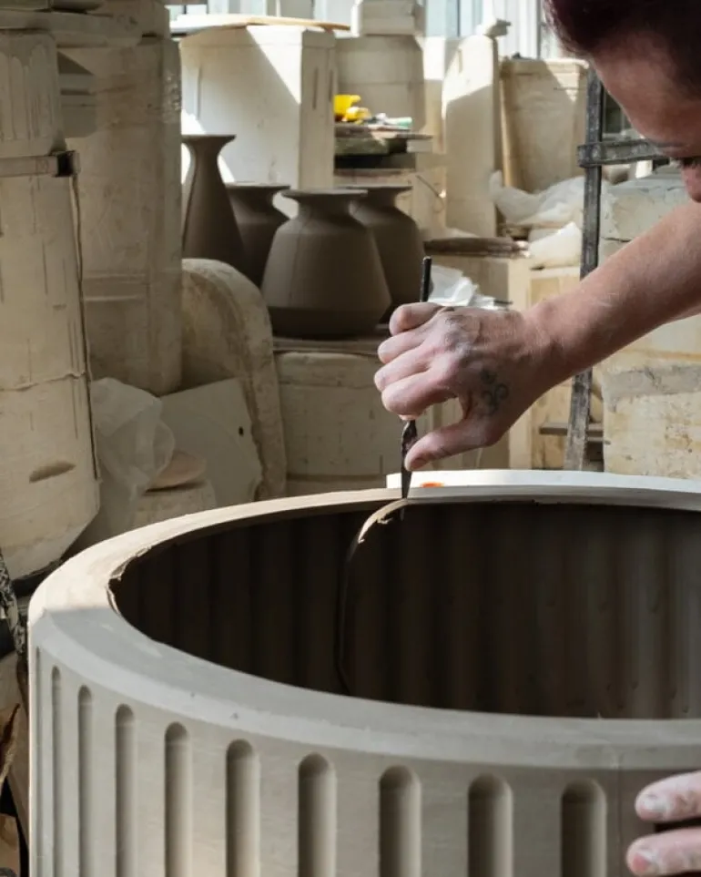 Miniforms’ sturdy Kolos side table borrows both its name and form from the Colosseum, an architectural masterpiece of ancient Rome. Designed by Yonoh Studio, the table’s design is a playfully ironic interpretation of that historic site. Made of ceramic with a high-gloss shiny finish, the side table will draw attention with its refined majesty in any room, from living rooms to public spaces.