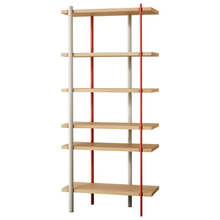 Miniforms’ Milonga bookcase brings a touch of stylish minimalism and industrial feel into any space, private or public. The open bookshelf charms with its playful character, which is the combination of different colored steel legs – yet the overall look remains sleek and elegant. The sculptural Milonga bookcase is suitable for living rooms, kitchens and offices, and can be used either against a wall or in the middle of a space as a room divider. The six oak shelves provide plenty of storage space for beautiful decorative objects, books, magazines, tableware and vases with flowers.