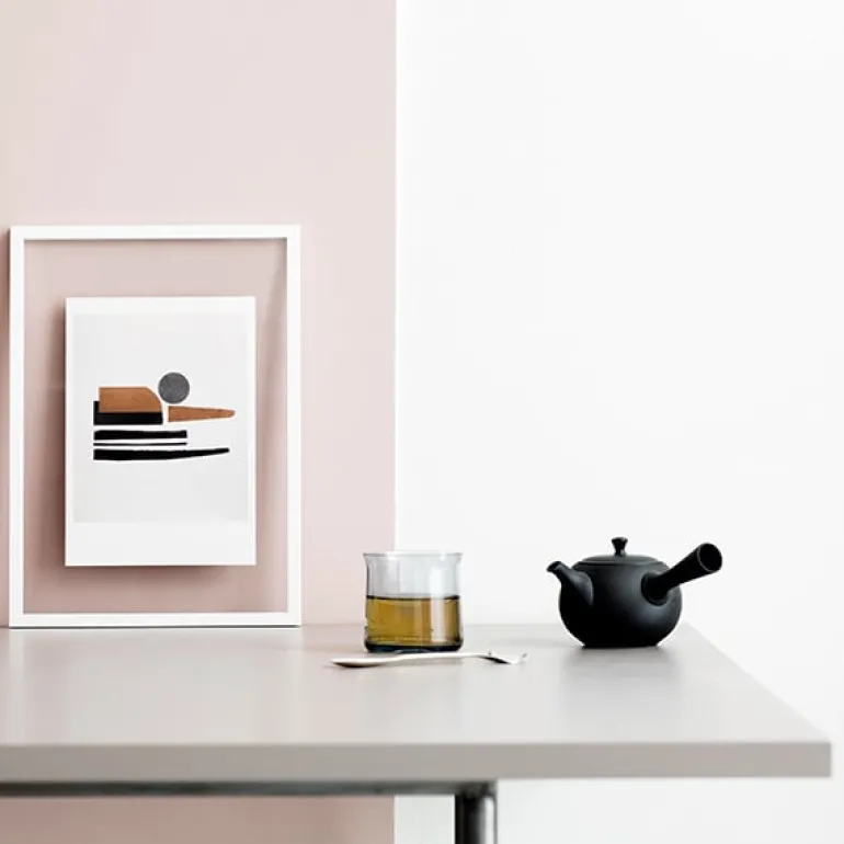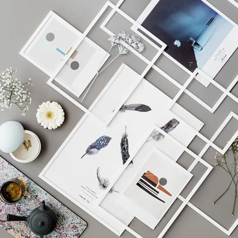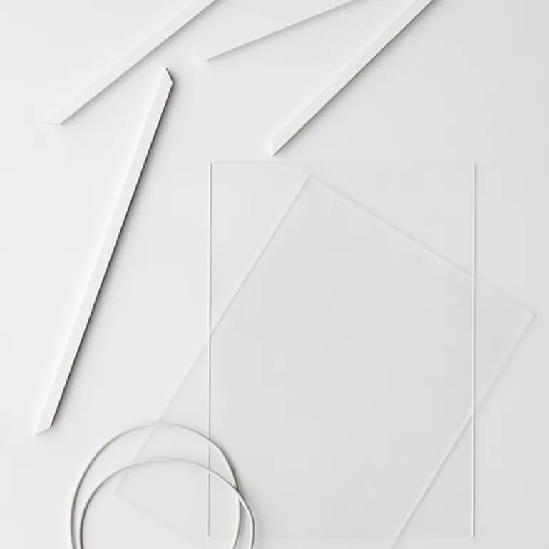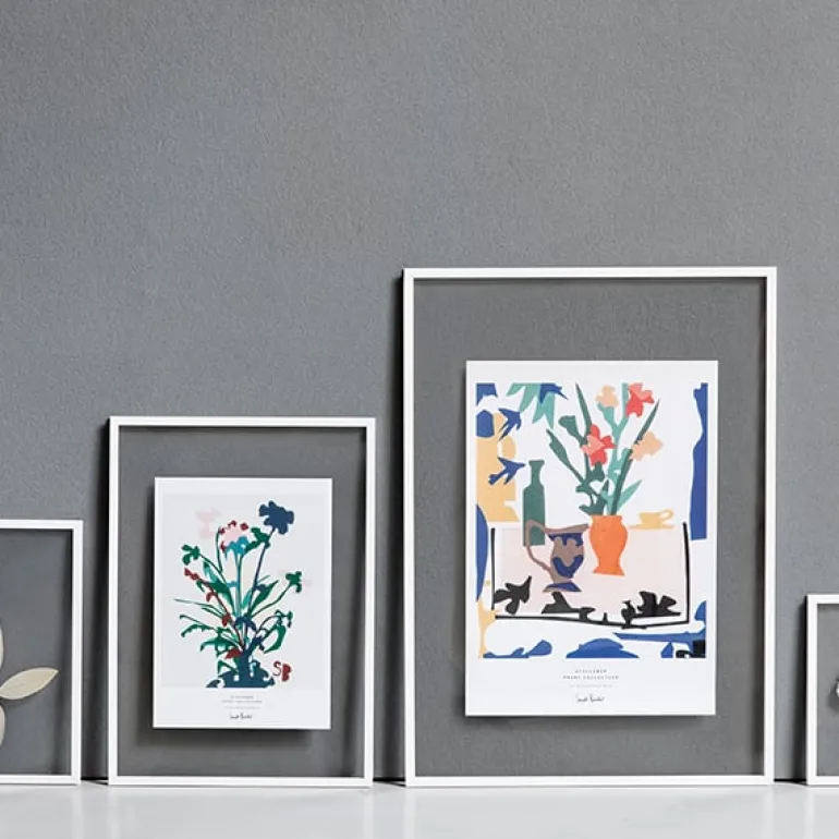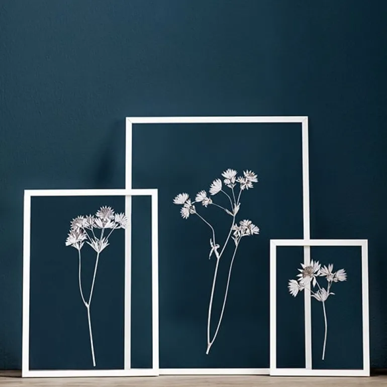 Moebe’s open back frame comprises four aluminum slats, two sheets of acrylic glass and a long rubber band that holds the parts together and functions as a hanger. The frame is perfect for displaying anything flat and two-dimensional from pressed plants, photos and drawings to Paper Collective’s transparent Floating Leaves posters.