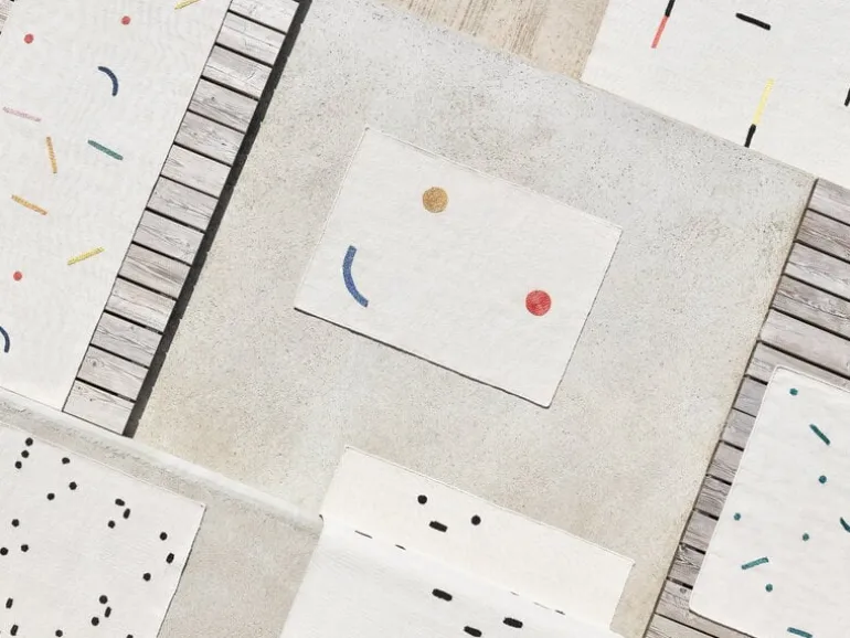 The Hymiö rug, designed by Tomi Leppänen for MUM’s, is adorned with an abstract pattern based on typographical elements. Part of Leppänen’s Typewriter collection, the rug is inspired by Bauhaus and specifically the work of textile designer Anni Albers, who experimented in the 1930s with using her typewriter as a tool for making patterns. The minimalist pattern of Hymiö (Finnish for “smiley” or “emoticon”) is also created using the full stops and dashes of a typewriter.