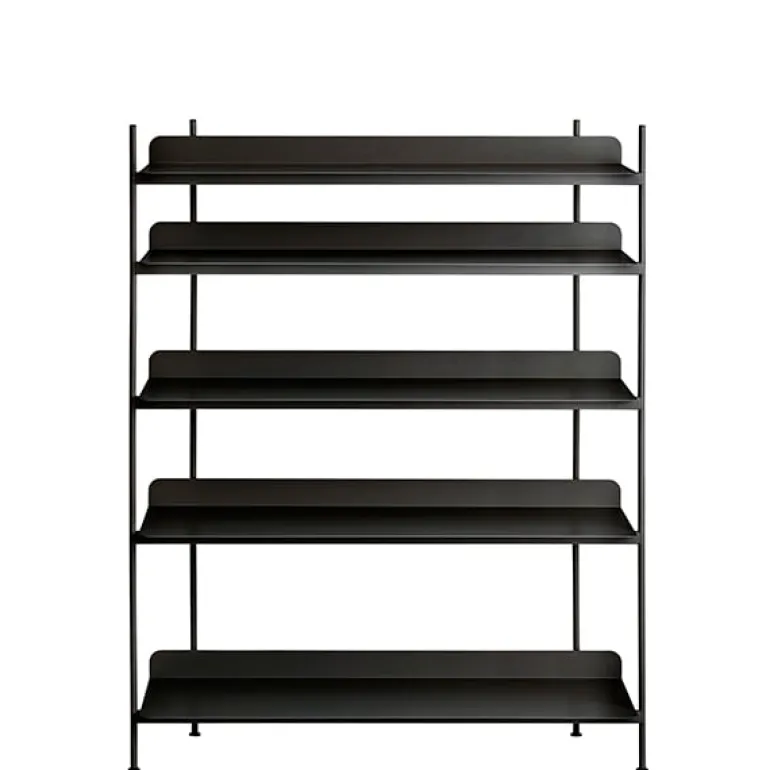 Compile, designed by Cecilie Manz, is a minimalist and functional shelving system that consists of simple laser-cut steel shelves and dividing tubes. The visually appealing design features a matt, powder-coated finish and round corners that give it a light and airy appearance. Sturdy Compile serves as a room divider, individual shelf module as well as a large storage system both in domestic and public environments.