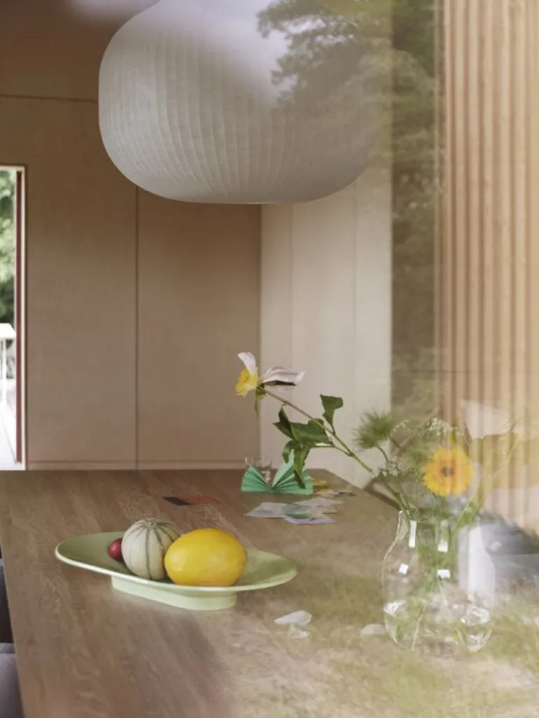 The Mere bowl is made of ceramic and finished with a high-gloss glaze. The glossy surface highlights the bowl’s unusual form and the shadows that play across it, but the also serves a practical purpose: it makes the bowl suitable for food and easy to clean. Mere is therefore perfect as a fruit bowl or serving dish for table settings but also as a storage container for your favorite decorative objects.