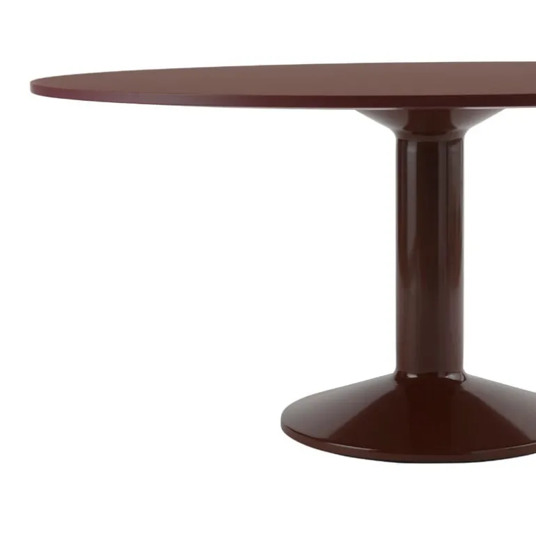 Muuto’s Midst table, designed by TAF Studio, is a round dining table that brings together two different materials and textures: the monolithic steel base boasts a high-gloss finish, while the tabletop has been coated with natural linoleum for a silky matte finish.