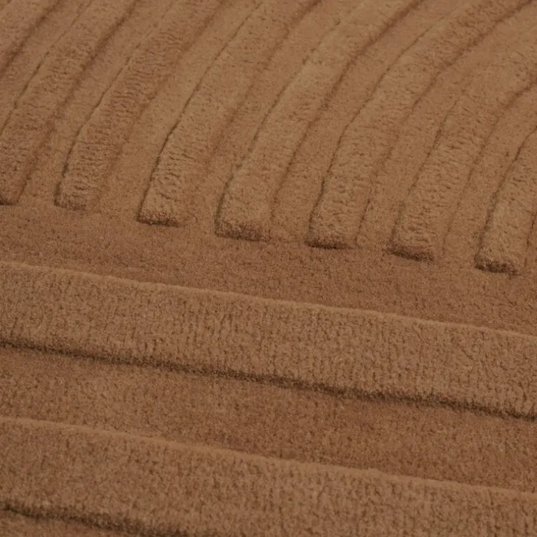 The Relevo carpet is made by hand tufting wool and then cutting it into different layers. The result is a three-dimensional pattern that emerges from the carpet. The pattern plays with shadows, creating the illusion of a two-colored carpet – in fact, only orange wool has been used. A single rounded corner crowns the soft look of the Relevo rug.