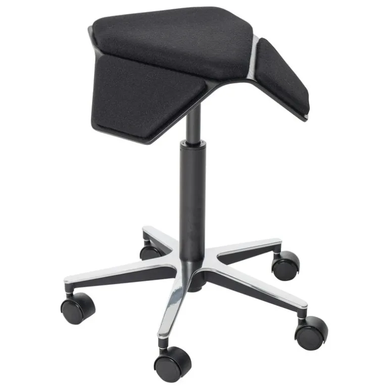 The ILOA+ saddle chair by the Finnish brand myKolme is a delightful combination of ergonomics and esthetics. The ILOA+ office chair features a metal base with castors and a height-adjustable seat, which encourages a natural upright spine alignment while supporting your thighs. The upholstered and cushioned seat is made of bent birch plywood and ash veneer in elegant black. The modern and compact ILOA+ saddle chair makes a space-saving seat option for any space.