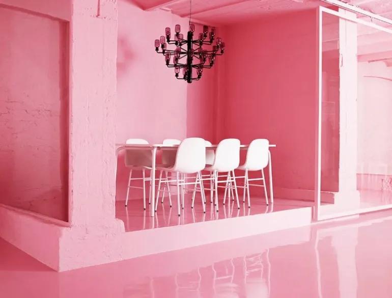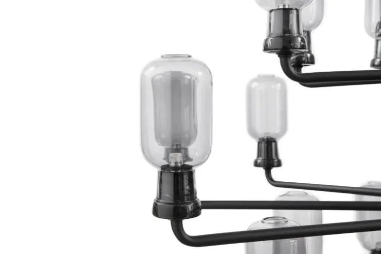 The Amp chandelier, designed by Simon Legald for Normann Copenhagen, is composed of Legald’s famous Amp lamps placed on a bold metal frame, making a stunning eye-catcher in a living room or above the dining table. The modern yet nostalgic pendant features miniature versions of Legald’s Amp lamps, which have a round shade emitting soft light, and a marble base that creates a beautiful contrast with the glass element.