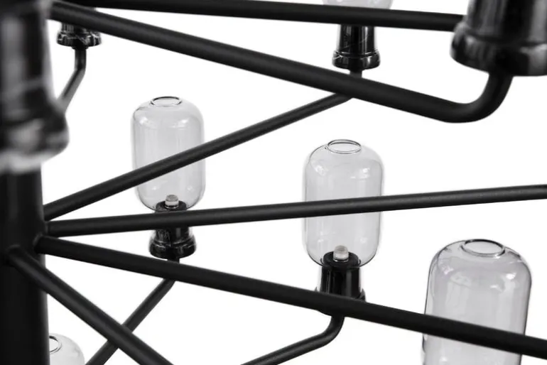 The chandelier is available in several different colors and two sizes: the smaller version with 15 lamps, and a bigger version with 35 lamps, designed especially for high ceilings, hallways and public spaces.