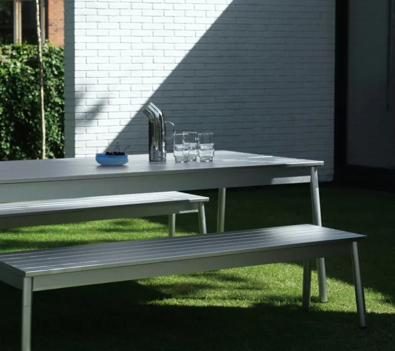 Normann Copenhagen’s Ex table adds a hint of industrial style to terraces, balconies and gardens. Designed by Simon Legald, the garden table is built to handle the challenges of weather with ease. Made from durable anodized aluminum, the Ex table resists the effects of sun and rain, standing strong season after season. The lightweight frame and minimalist design make the table fit for indoor use, too.
