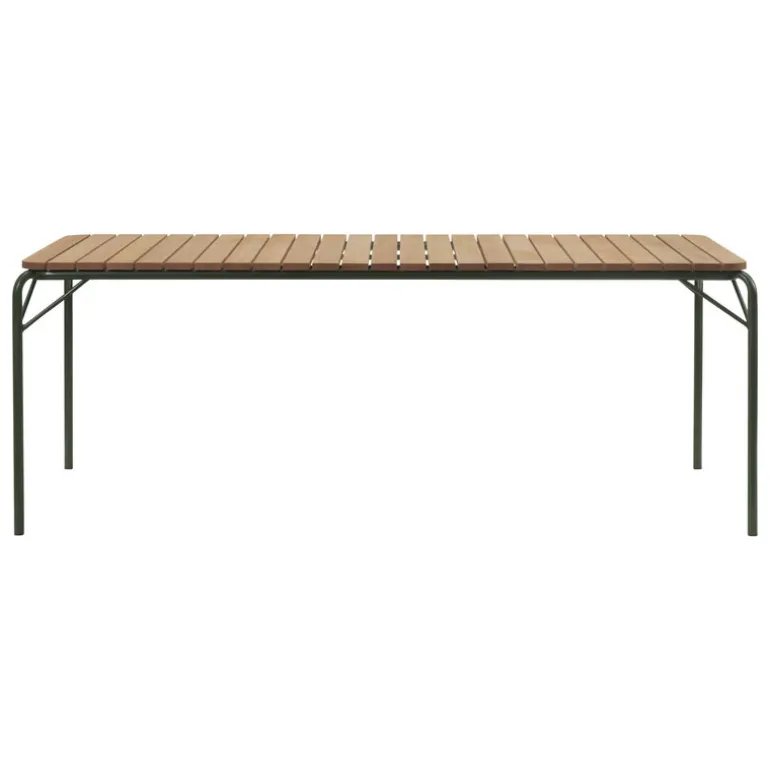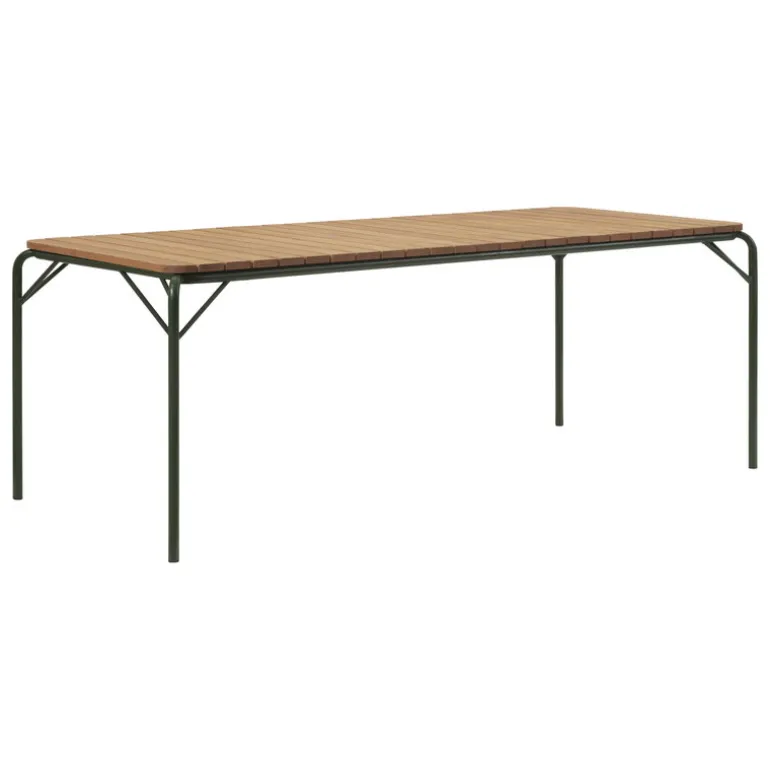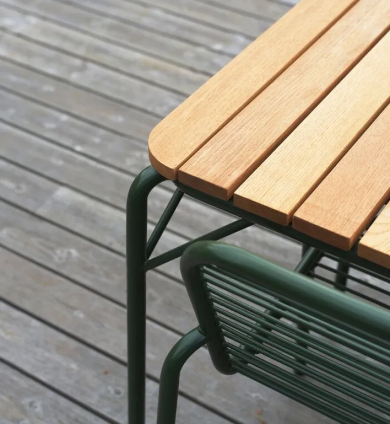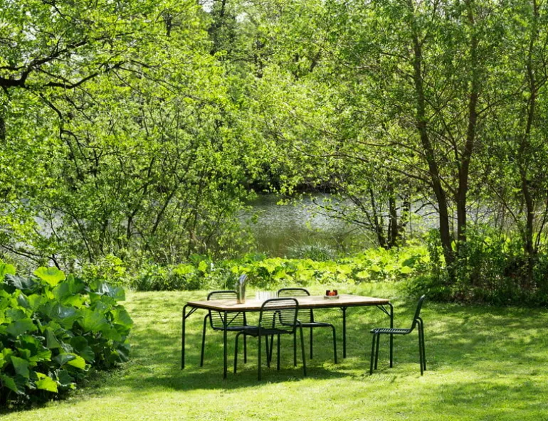 Designed by Simon Legald, the Vig collection offers a wide range of outdoor furniture from patio chairs and benches to garden tables, making it easy to turn your day-to-day garden into an inviting and beautiful green oasis. The Vig table is built to last because of its stylish appearance and its durable material: the double powder-coated steel surface is highly resistant to varying weather conditions, ensuring that the dining table can withstand scorching sunshine and pouring summer rain. In this Vig table, the steel surface is combined with charming Robinia wood, which provides a beautiful, natural contrast to the metal frame.