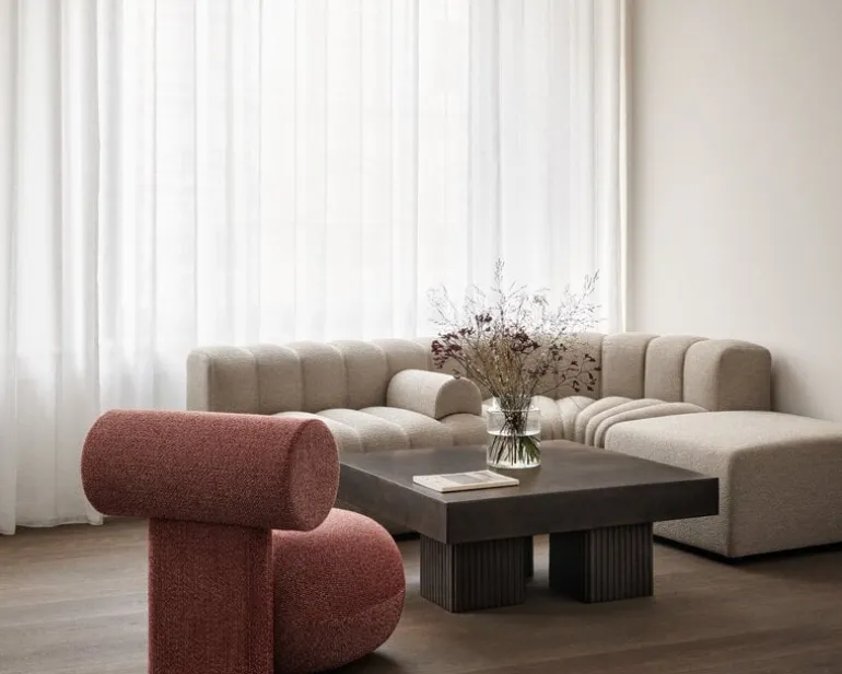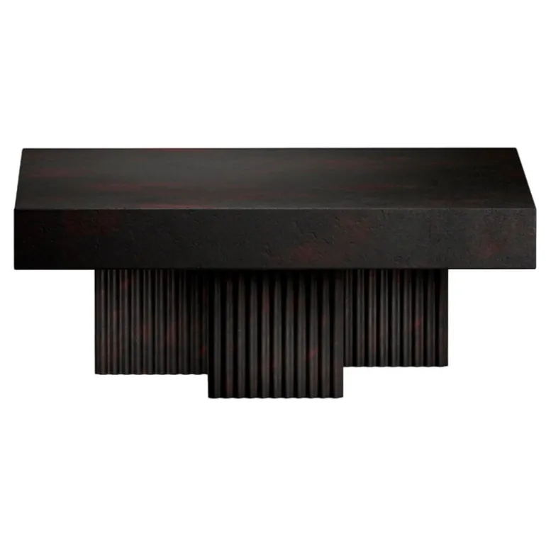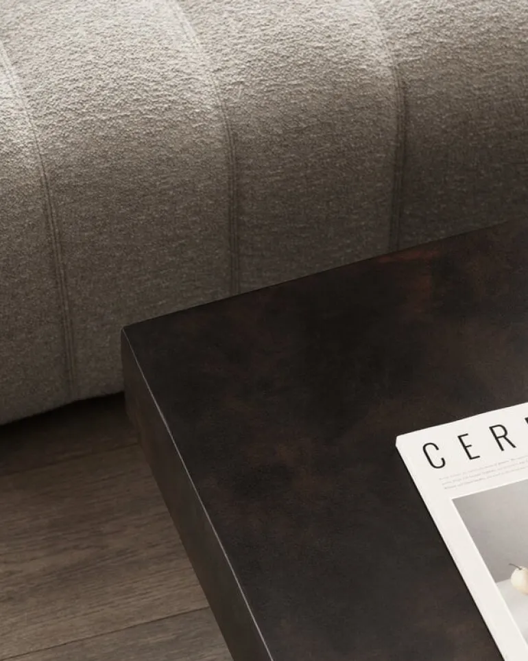NORR11’s Gear coffee table is a sculptural concrete table with a design inspired by the brutalist architecture of the mid-20th century. The Gear Square coffee table features a sturdy, square-shaped table top supported by three block-like legs, arranged in a slightly asymmetrical configuration. Concrete gives the table a lively, tactile texture, which is emphasized by the fluted details of the legs.