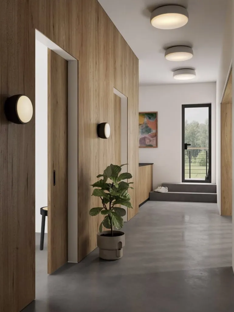 The luminaire consists of a smooth metal frame and a glowing opal glass disc. The circular shade reflects soft light around it, creating mood lighting in the room. The beautiful lamp is charming on its own but can also be mounted in a row of several luminaires on a corridor wall or ceiling. Over Me lamp is certified for use in wet areas, making the minimalist luminaire an excellent choice to brighten up a bathroom.