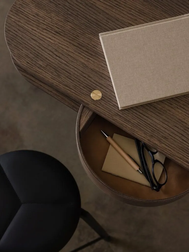 Although the Valet console table has been stripped down to its most minimalist appearance, the amount of storage space is maximized. Underneath the oak tabletop, you’ll find a beautiful round drawer and a narrow shelf for storing important papers and other essential objects.