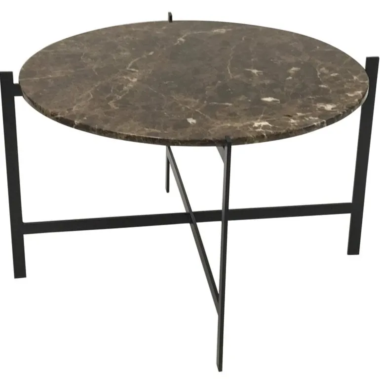 OX Denmarq’s Deck table, designed by Dennis Marquart, is a bold combination of marble and metal. Consisting of a round marble top and an angular, simplistic steel frame, the Deck table is a striking choice as a coffee table for a living room or an extra table for various different decors. The brown Emperador marble gets its nuanced look from lighter veins crossing the dark stone, and small details such as cracks are also part of its natural character. The marble top is attached to the metal frame with screws.
