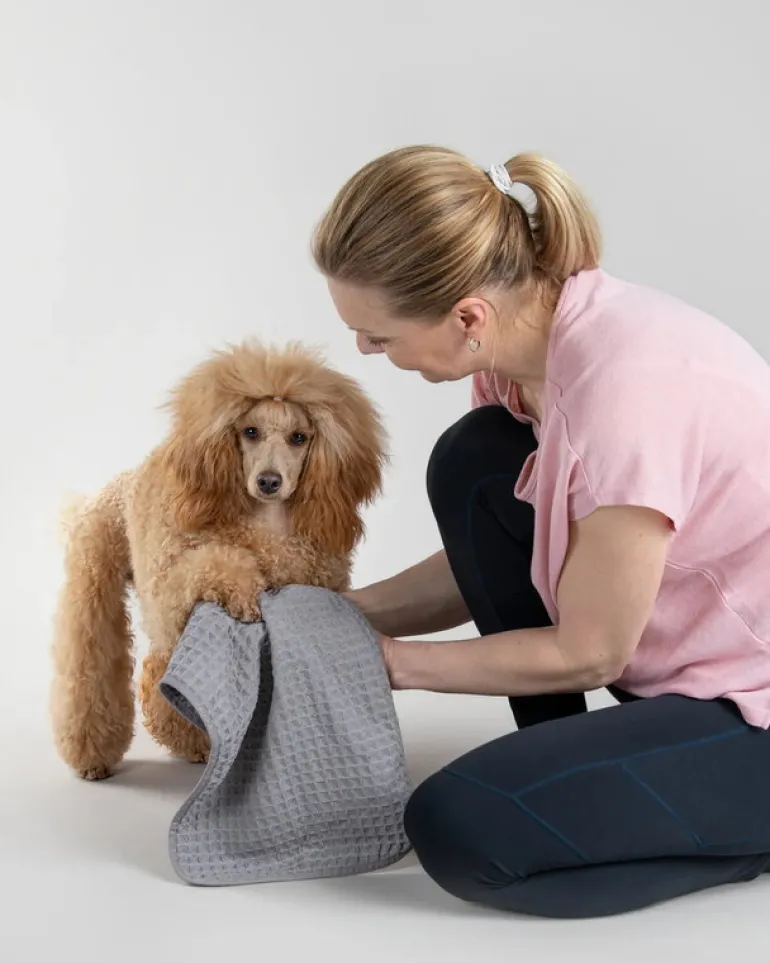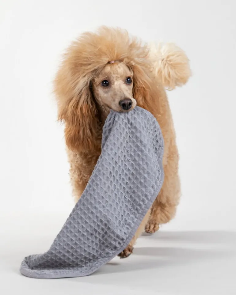 PAIKKA’s drying towel is perfect for tackling dogs’ muddy paws and wet fur. The waffle-textured microfiber outer layer effectively removes moisture, while the towel’s SILVERPLUS treatment helps keep unwanted odors at bay. Lightweight and compact, the dog towel packs down small and features a hanging loop for easy storage.