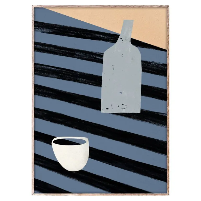 Paper Collective’s Il Sistema Degli Oggetti 05 poster by Milanese design studio, Studiopepe, features an intriguing composition balancing abstract and figurative. The pieces of tableware and cutlery arranged on top of a brisk striped pattern evoke images of a colorful table setting but leave room for interpretation. The vibrant shades and organic shapes of the charismatic poster lend the interior a powerful, mood-boosting touch.