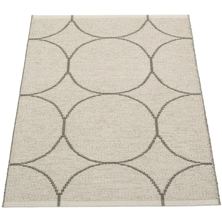 Boo plastic rugs from Pappelina are decorated with large, graphic circles and woven on a traditional loom in Dalarna, Sweden. The rugs are reversible and have an opposite pattern on the other side. Made of phthalate-free PVC ribbon, the rugs are durable and easy to care for, and their stylish two-tone colors suit various decors. Due to its narrow form, the rug can easily be put to use as a stunning hallway runner, kitchen area rug or outdoor rug. The Boo rugs feature welded ends and an embossed Pappelina logo.