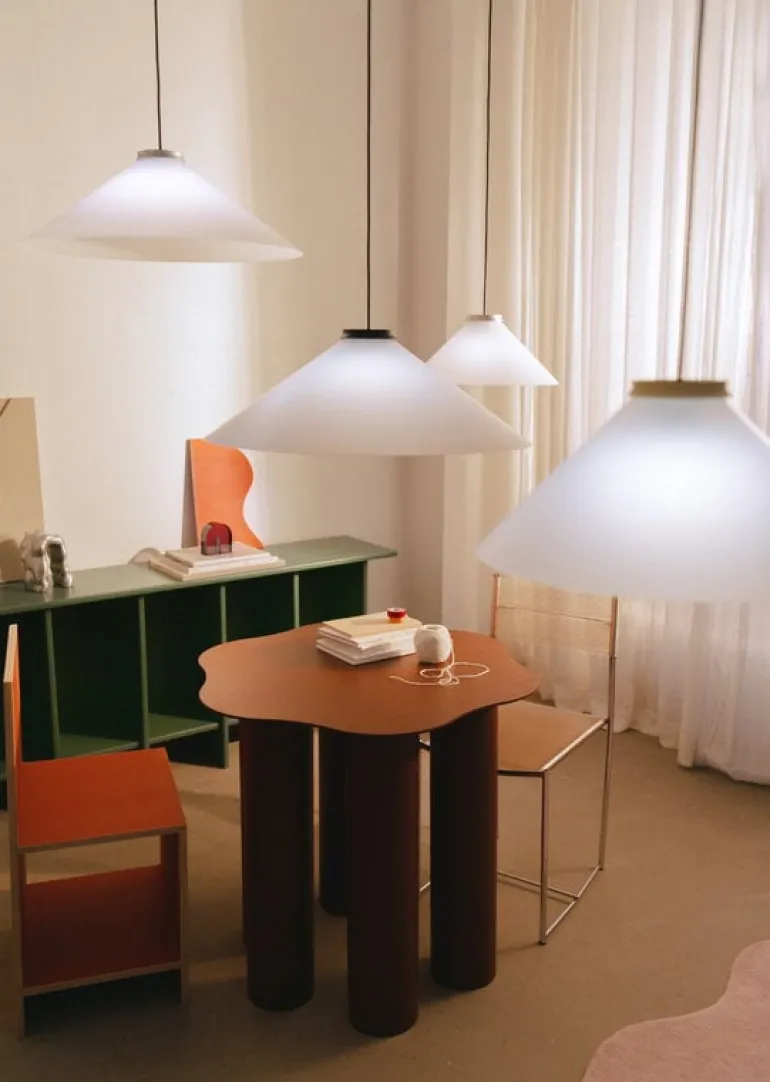 Aline combines strict purity with delicate softness: the geometric shape and minimalist silhouette are counterbalanced by the shade’s smooth matte surface and translucent material, through which the light is filtered pleasantly also upwards. The designers opted for high-quality acrylic for the shade, as it is not only light and durable, but also recyclable. Pholc actually hopes that the Aline lamps will be returned to them at the end of their lifecycle so that the materials can be reused and recycled.