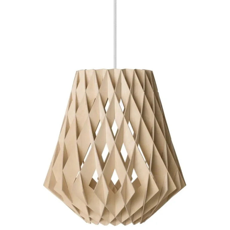 Pilke 28 is part of the simple yet ornamental Pilke Signature Collection designed by Tuukka Halonen. Crafted from birch plywood, the Pilke luminaires are an enchanting combination of technology and tradition: Halonen sought influences for the design from traditional Finnish wood crafts but utilized today’s manufacturing methods and materials. As a contemporary interpretation of shingle work, the lamps are characterized by a crystal-like pattern that filters the light pleasantly and casts beautiful shadows on the walls and ceiling. All Pilke lamps are designed and handcrafted in Finland.