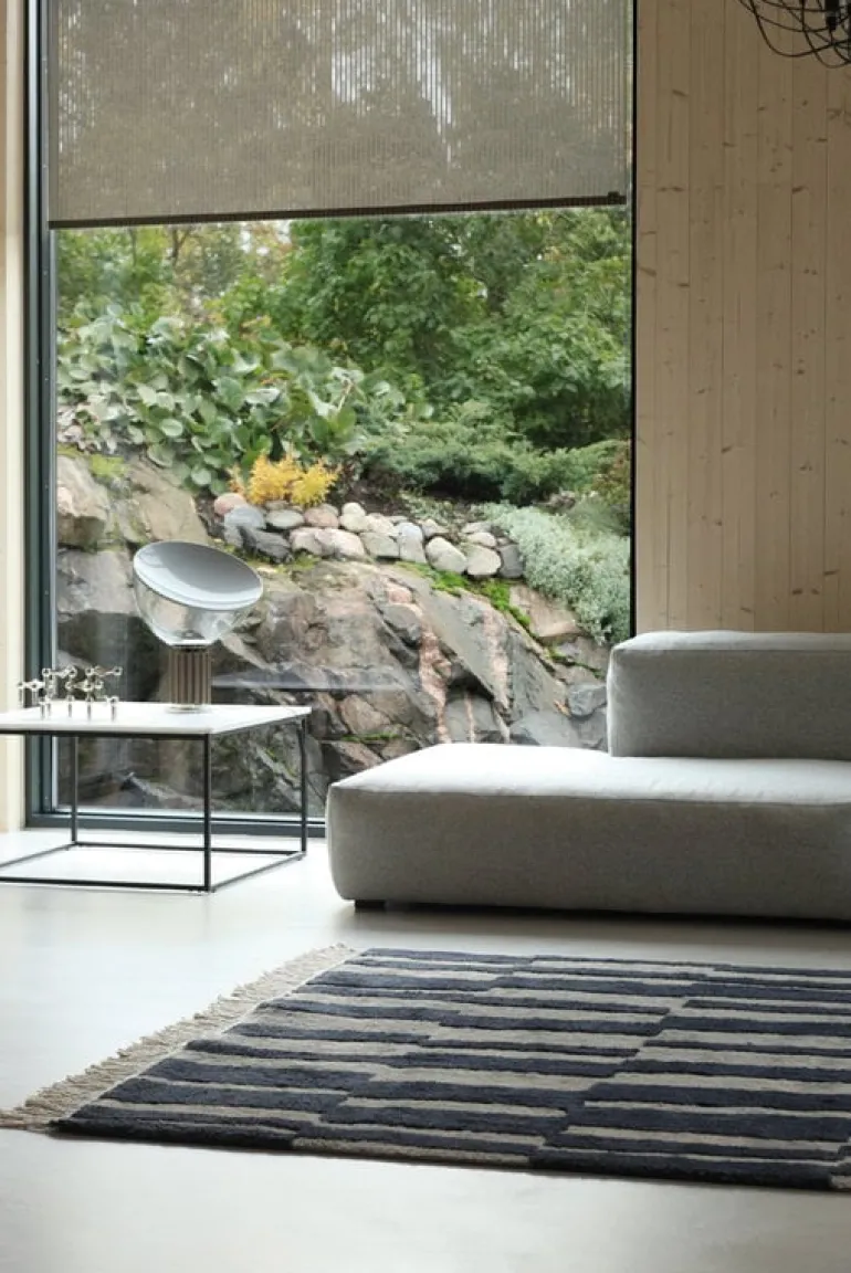 The Pilari rug by Roots Living, designed by Ulla Koskinen, is part of the brand’s Designer collection. The rug’s graphic, asymmetrical pattern is based on the designer’s hand-drawn sketches, and it is accentuated by the alternating heights of the pile. The Pilari rug with a gray-brown pattern is made from bamboo and wool; the natural materials add tactility and a sense of softness to the appearance. The rug’s laid-back design is completed by the fringes at the rug’s ends.