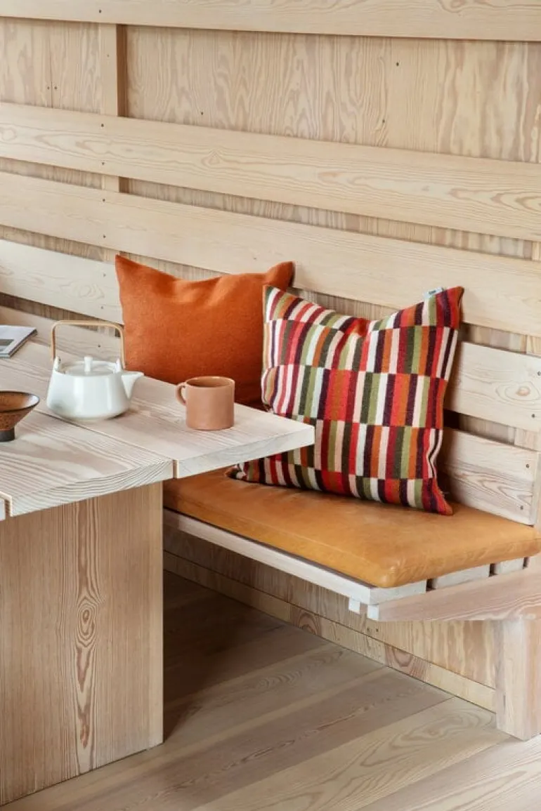 Røros Tweed’s Ida cushion, designed by Anderssen & Voll, features a colorful, checkered pattern inspired by patchwork and handmade tapestries. The designers, Torbjørn Anderssen and Espen Voll, created the pattern by making a full-scale model with pieces of colored paper – so instead of digital design or drawing, it was designed literally by hand. To honor the design process, traces of the human hand, like small imperfections and irregularities, were preserved in the final product.