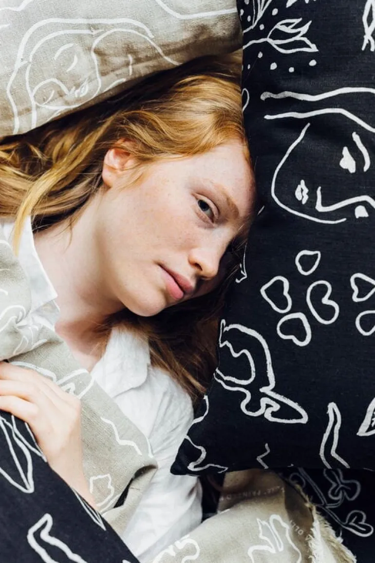 The Onnenmaa cushion cover by Saana ja Olli features an organic pattern formed by human figures, plants and other elements of nature. Painted with loose brushstrokes, Onnenmaa (”Arcadia”) sketches a dream-like safe space from the unstable world situation.