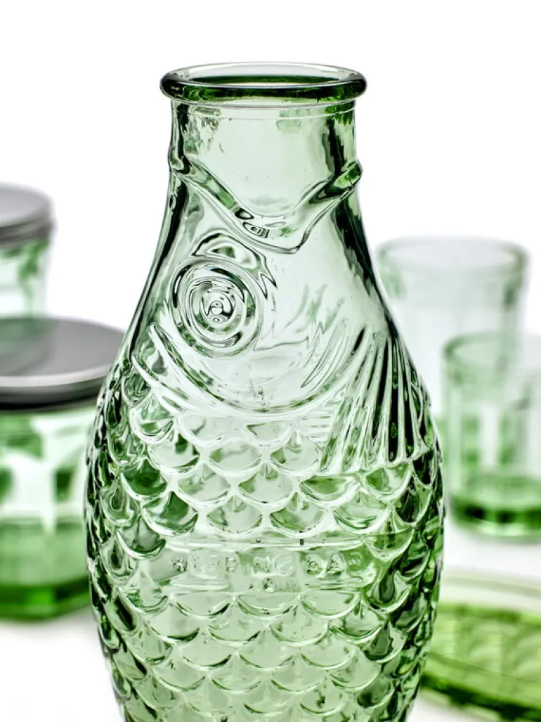 - The Fish & Fish bottle charms with its fish-like appearance and distinctive, delicate green glass. Resembling a herring, the playful bottle can be used as a carafe for serving drinks or as a vase for flowers but it also brings joy as a decorative object as such.