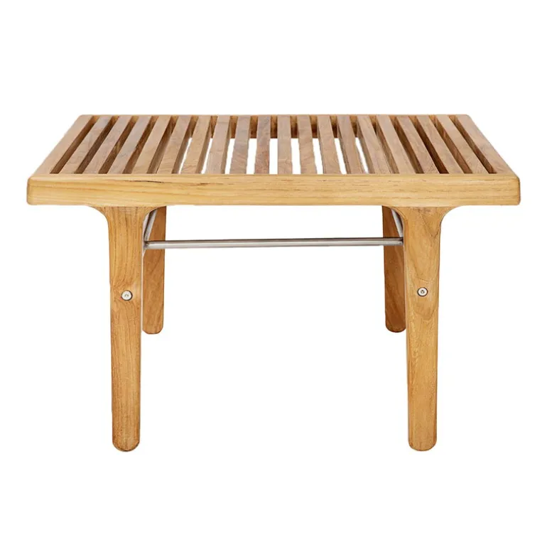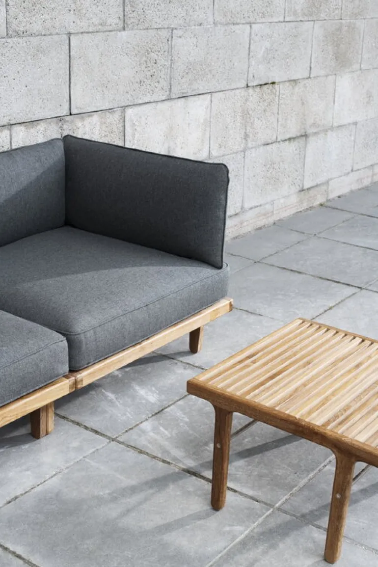 The RIB table is made of high-quality, untreated teak. Over time and use, the lounge table will become even more distinctive: teak is a classic outdoor material that ages beautifully, developing a lovely patina and turning into a sophisticated silvery gray tone. However, those who like the authentic golden shade more need not be worried, as the original color can be retained by treating the furniture with a suitable teak sealant.