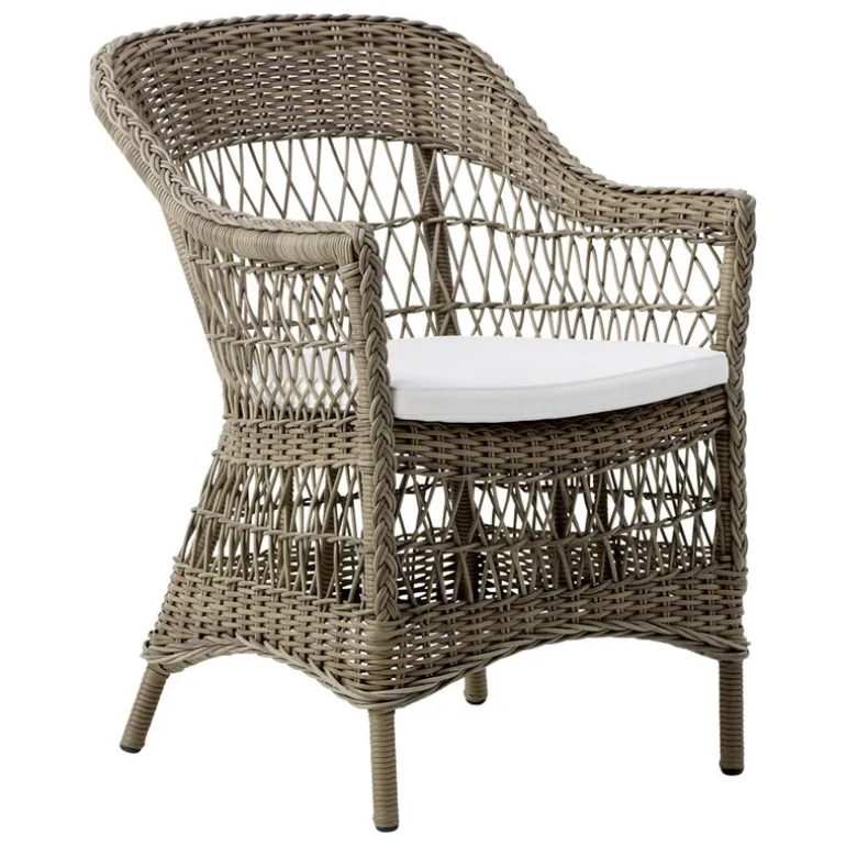 Sika-Design’s Charlot chair is an outdoor dining chair boasting a high backrest with a simple, airy weave made from synthetic rattan. The seat cushions are designed for outdoor use and feature removable, machine-washable covers.