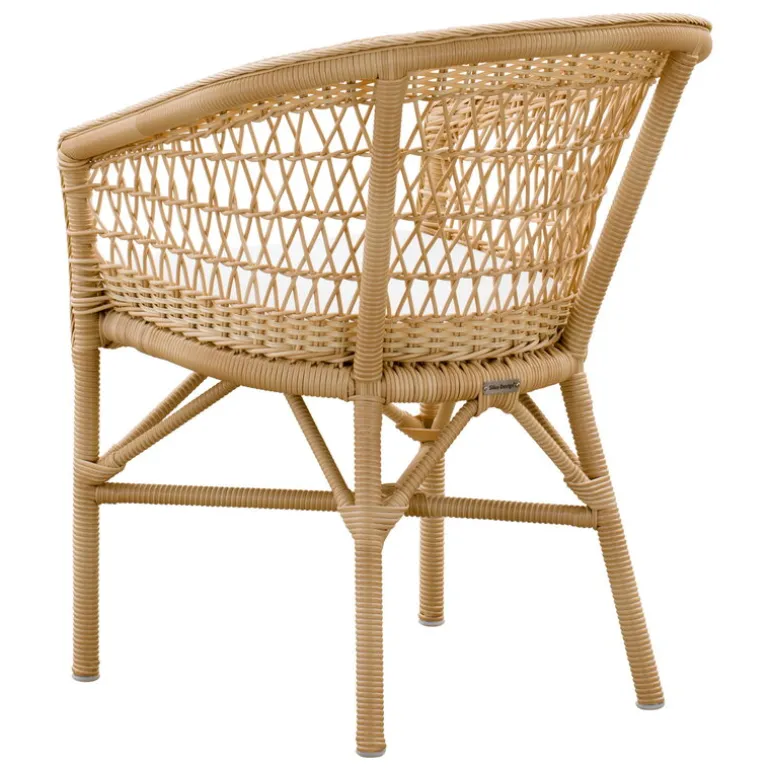 Sika-Design’s Emma chair is an outdoor dining chair boasting a delicately curved backrest with a decorative weave made from synthetic rattan. The seat cushion is designed for outdoor use and features a removable, machine-washable cover.
