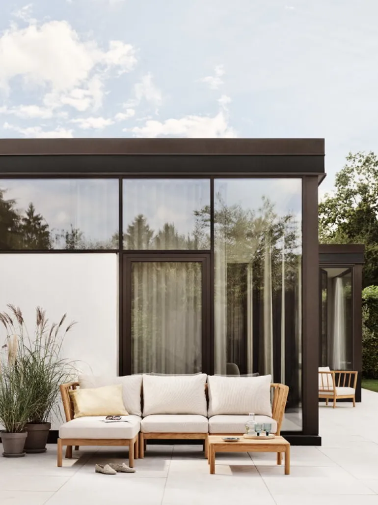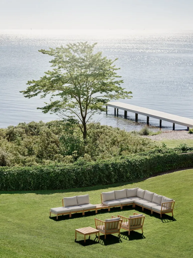 The Tradition patio furniture was created by Danish designer Povl B. Eskildsen. Having grown up with one foot in a teak furniture factory, Eskildsen’s extensive experience with teak is evident in the furniture’s skilful details and serene simplicity, which leaves room for the wood’s natural beauty. You can preserve the teak’s original warm tone by regularly oiling the surface or allow it to slowly patina to an attractive gray shade.