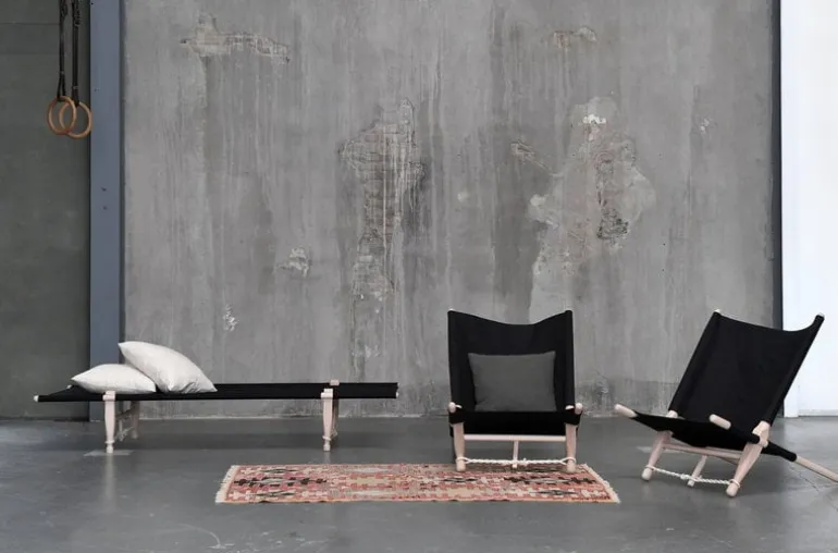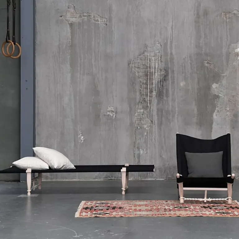Skovshoved Møbelfabrik’s OGK safari chair shares the same simple esthetics as the OGK daybed, both designed in the 1960’s by Ole Gjerløv-Knudsen. The convenient chair comes in a linen bag with a shoulder strap and it’s fast and easy to assemble – no screws or tools are needed. The frame is made of untreated beech and the cover is black linen. The twisted sisal ropes and long back legs are an essential part of the structure and double as beautiful details. The OGK safari chair is perfect for lounging in any space – living room, bedroom, terrace and outdoors.