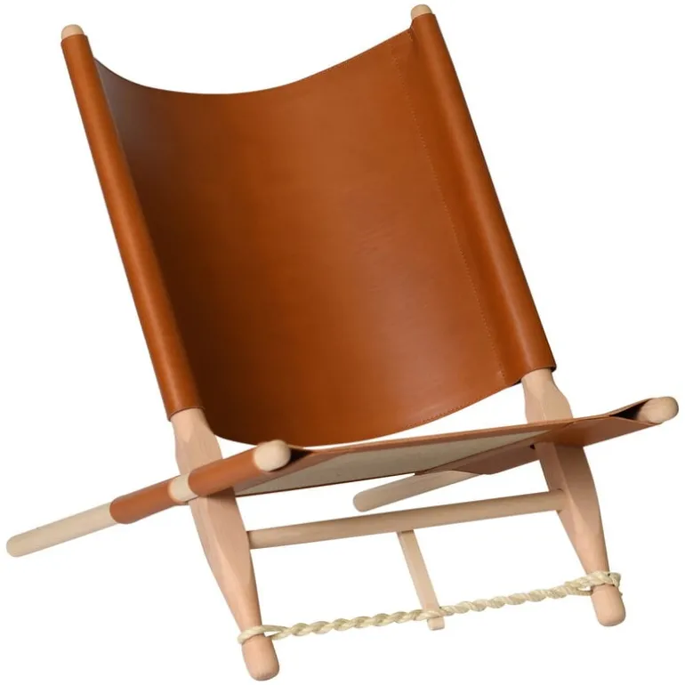 Skovshoved Møbelfabrik’s OGK safari chair shares the same simple esthetics as the OGK daybed, both designed in the 1960s by Ole Gjerløv-Knudsen. The convenient chair comes in a linen bag with a shoulder strap and is fast and easy to assemble – no screws or tools are needed. The frame is made of beech and the cover is stylish cognac leather. The twisted sisal ropes and long back legs are an essential part of the structure and double as beautiful details. The OGK safari chair is perfect for lounging in any space – living room, bedroom, terrace and outdoors.