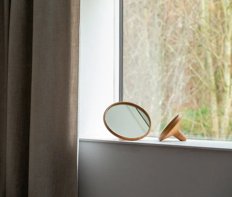 Spring Copenhagen’s Satellite is an attractive, round hand mirror framed by natural oak wood. The small handle of the mirror doubles as a stand, allowing you to place the mirror on a table in any room. Designed by Christoffer Skjøtt, the Satellite mirror is perfected with beautifully crafted wooden joints.