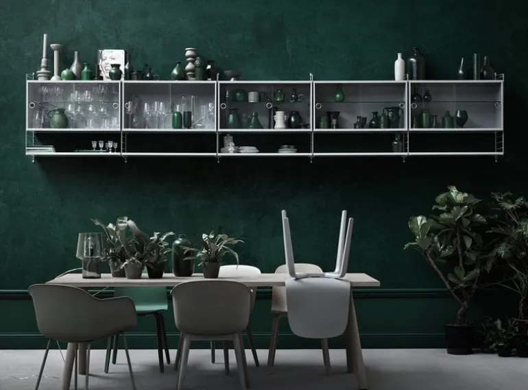 The String display cabinet with sliding glass doors complements the String shelving system in an elegant and practical manner. Suitable for all 11.81 in (30 cm) deep String panels, the display cabinet features two sliding glass doors and one adjustable shelf. This glass display cabinet provides beautiful and dust-free storage space for wine glasses and porcelain plates in the kitchen as well as decorative objects in the living room.