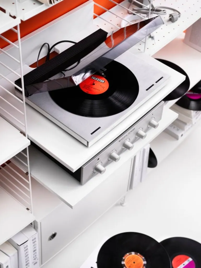 The String Media shelf is a versatile addition to the String System collection. String Media is designed especially for vinyl record players and other technical devices, and thanks to the slot in the back, you can easily hide all cords and cables behind the shelf. The sturdy shelf can also be used as a compact workspace or an extra table in the kitchen. The String Media shelf fits all 11.81 in (30 cm) deep String wire panels.