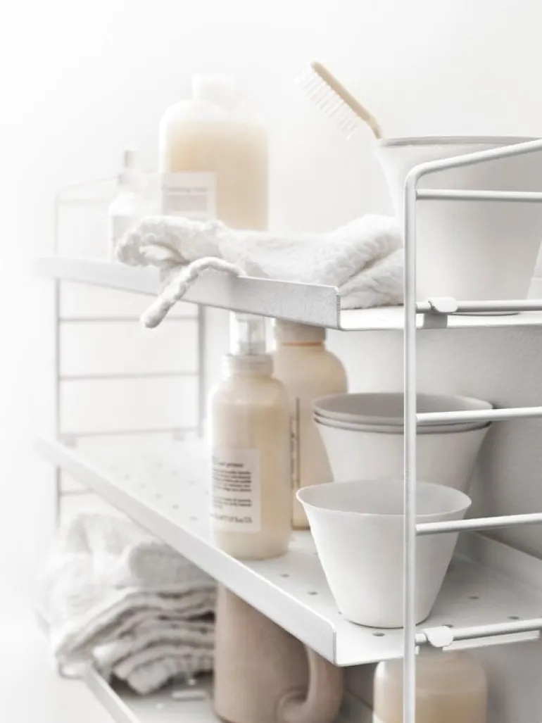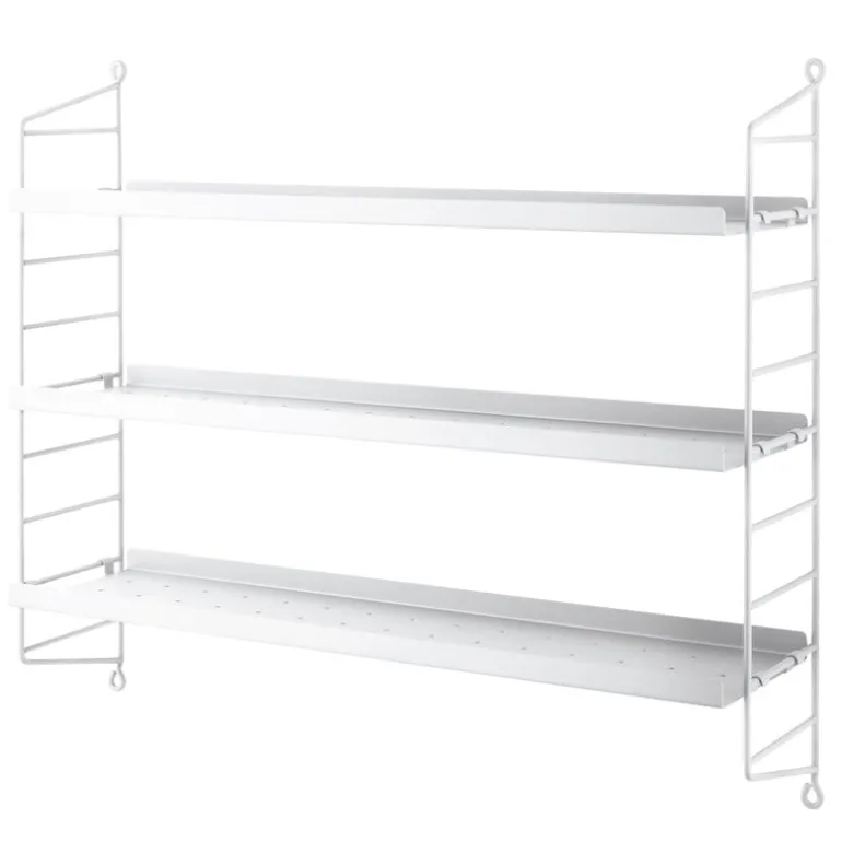 The String Pocket metal shelf was designed in collaboration with Swedish designers Anna von Schewen and Björn Dahlström. The metal shelf is particularly well suited for the kitchen or bathroom due to its perforated shelves: you can easily add accessories to them, such as hooks for hanging towels, oven mitts or kitchen utensils. The shelves have thin lipped edges that help keep their contents secure.