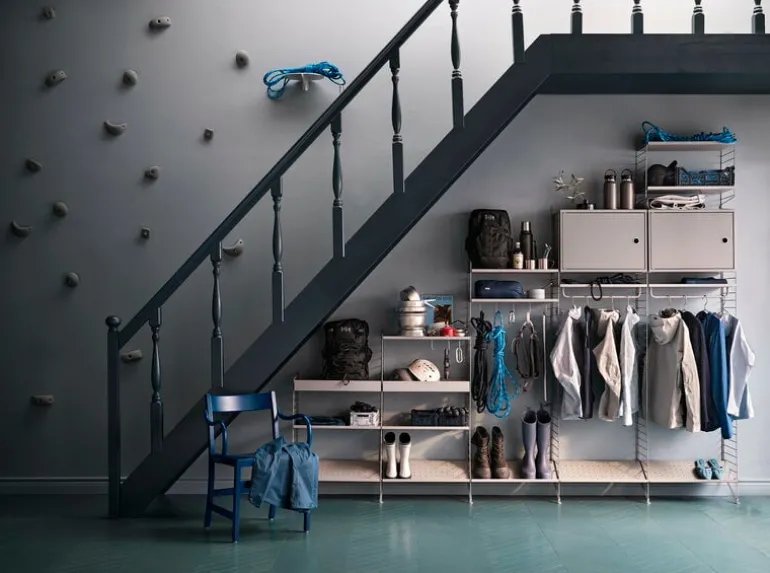 String metal shoe shelf is designed especially for storage solutions of hallways and walk-in closets. The shoe shelf combines with 11.81 in (30 cm) wide String side panels.